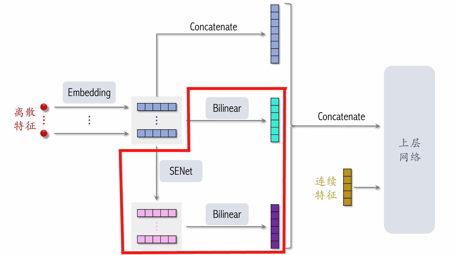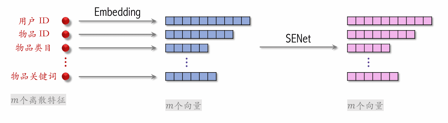 • SENet 对离散特征做 field-wise 加权。