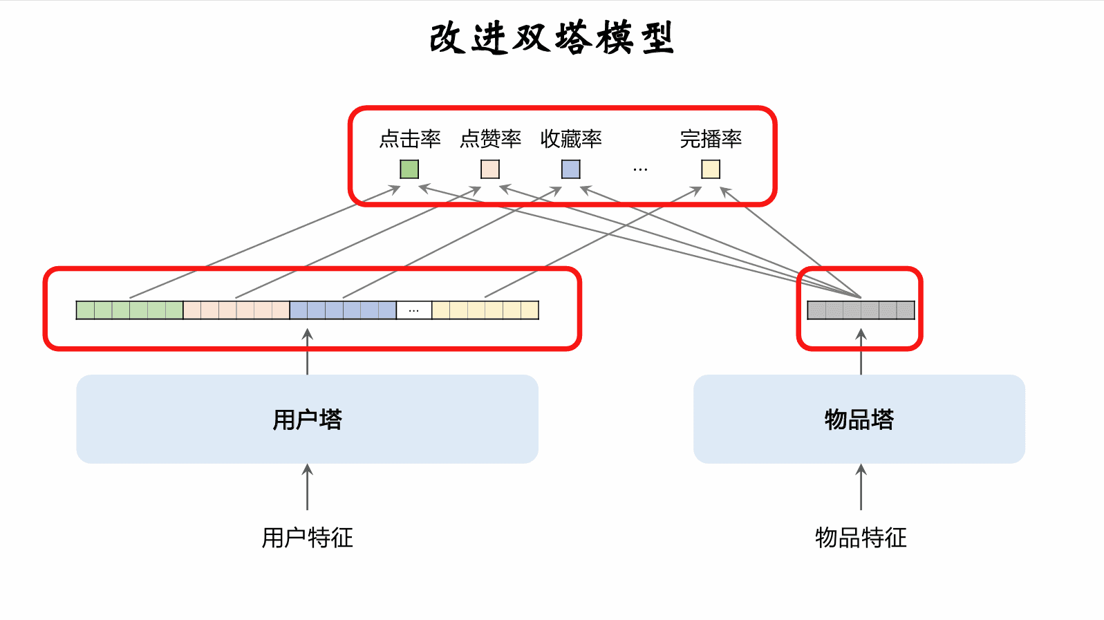 • 双塔模型:优化正负样本、改进神经网络结构、改进训练的方法。